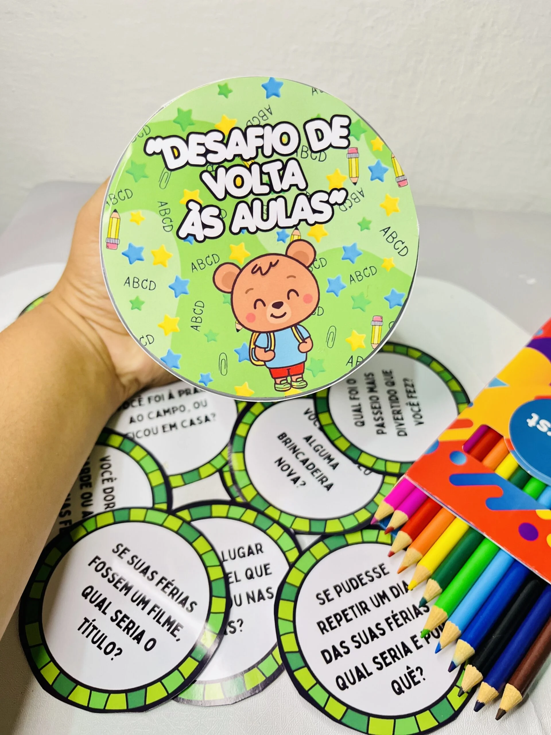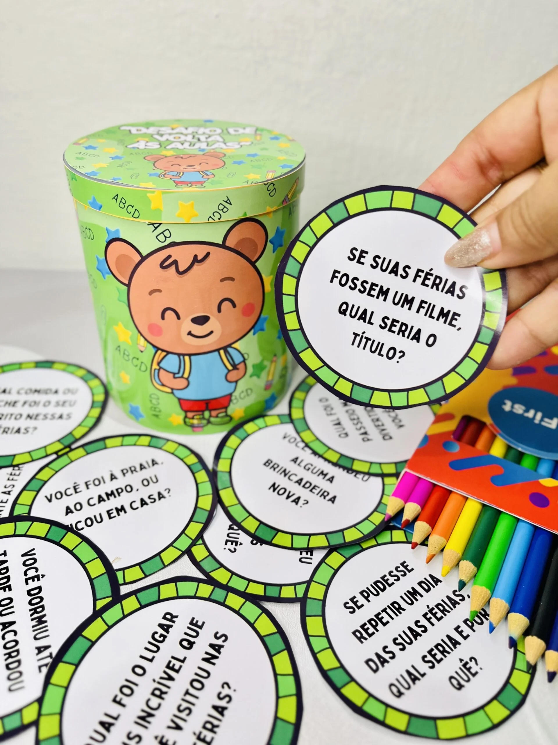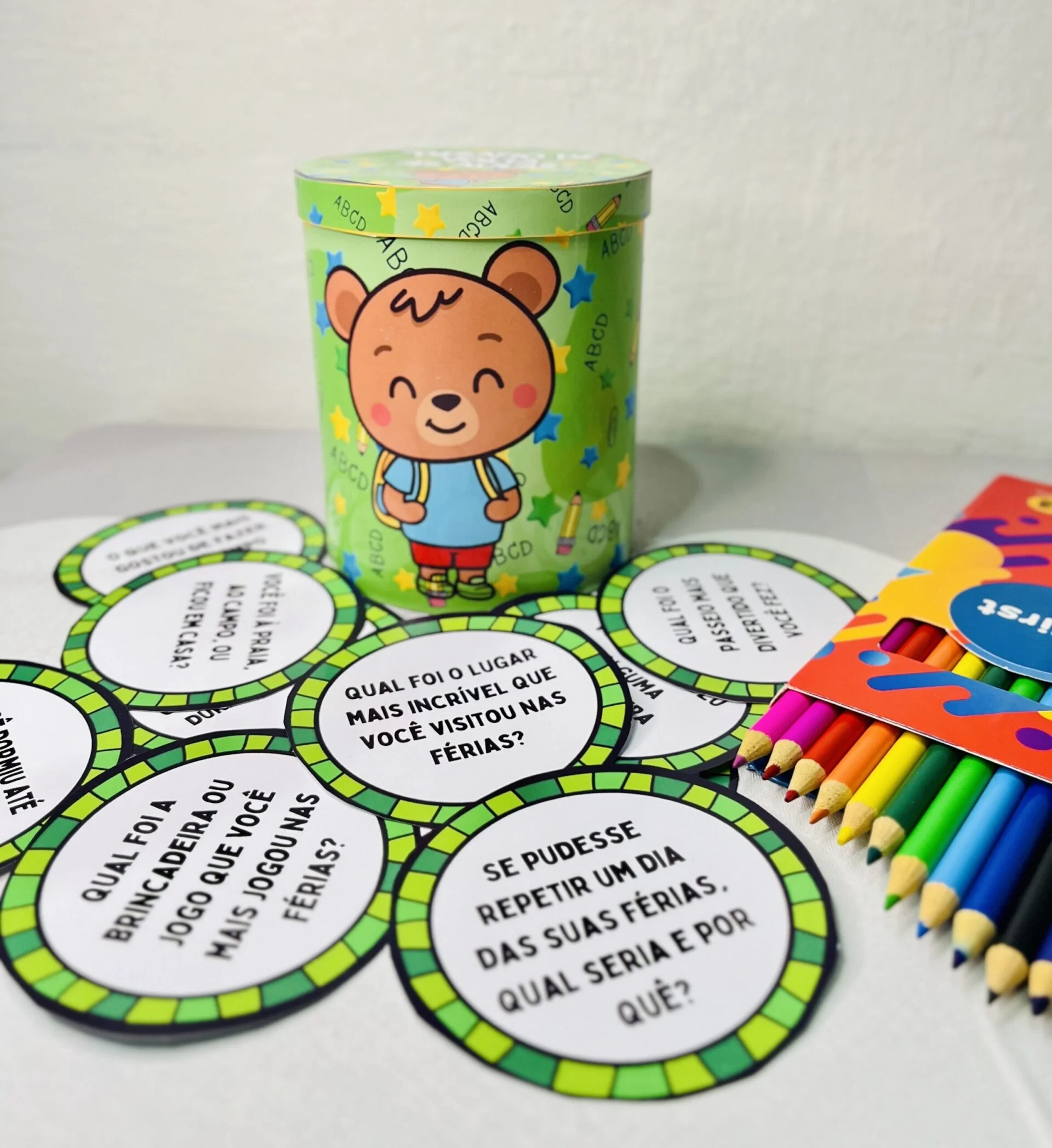 O Desafio “Volta às Aulas na Lata” é aquela atividade de boas-vindas que aproxima a turma logo nos primeiros dias de aula. De forma leve e divertida, as crianças sorteiam perguntas de uma lata e compartilham suas experiências de férias, falando ou escrevendo sobre o que viveram.