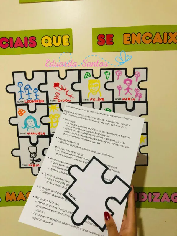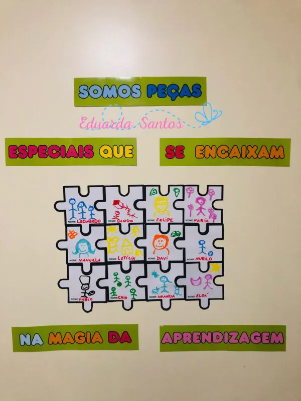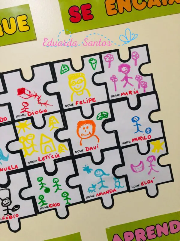 Na proposta, cada criança decora sua própria peça de quebra-cabeça com desenhos ou palavras que representem algo especial sobre si. Depois, todas as peças são reunidas em um painel coletivo, mostrando que cada um é único e essencial para a construção da turma.