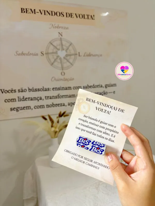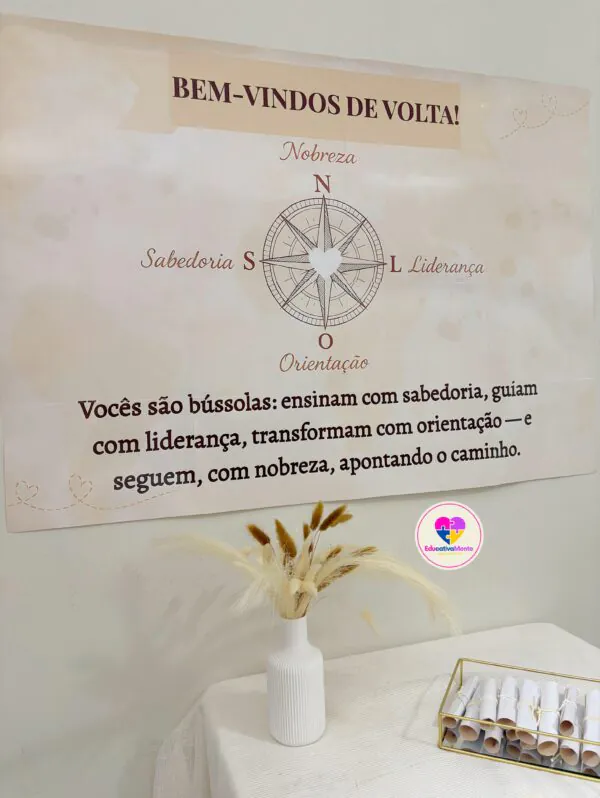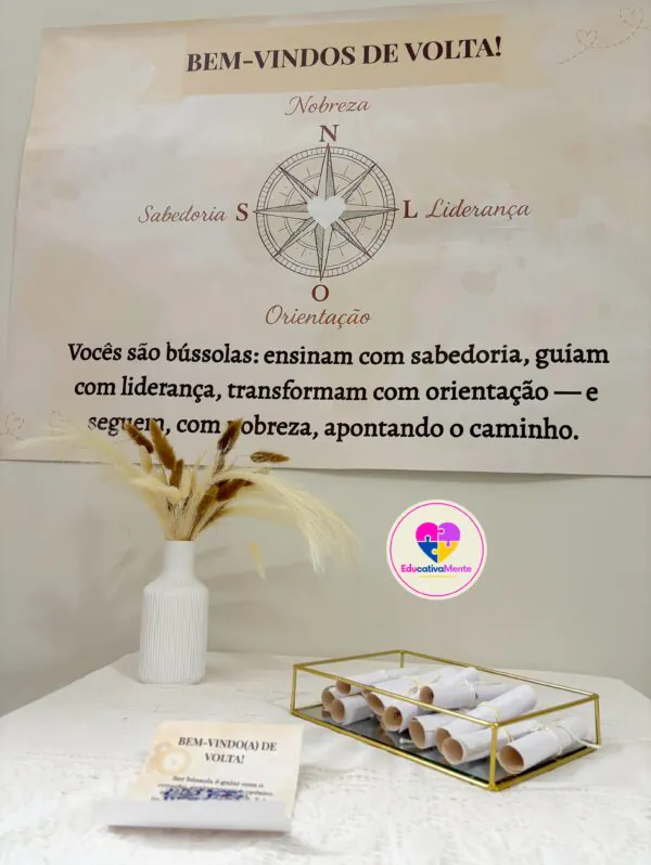 🔎 Observação: a posição da bússola foi ajustada no PDF final. O arquivo disponível para download já está 100% corrigido.Celebre o retorno da equipe pedagógica com um material acolhedor, simbólico e cheio de significado.